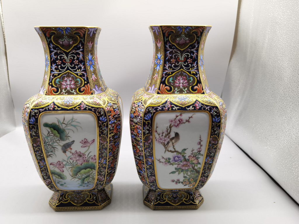 (清乾隆) 磁胎洋彩青地金花魚(yú)遊轉(zhuǎn)心瓶